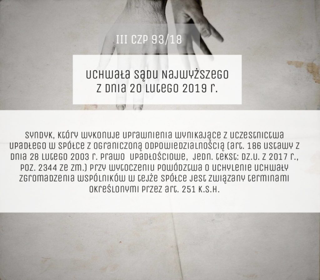 Syndyk, który wykonuje uprawnienia wynikające z uczestnictwa upadłego w spółce z ograniczoną odpowiedzialnością (art. 186 ustawy z dnia 28 lutego 2003 r. prawo upadłościowe, jedn. tekst: Dz.U. z 2017 r., poz. 2344 ze zm.) przy wytoczeniu powództwa o uchylenie uchwały zgromadzenia wspólników w tejże spółce jest związany terminami określonymi przez art. 251 k.s.h.